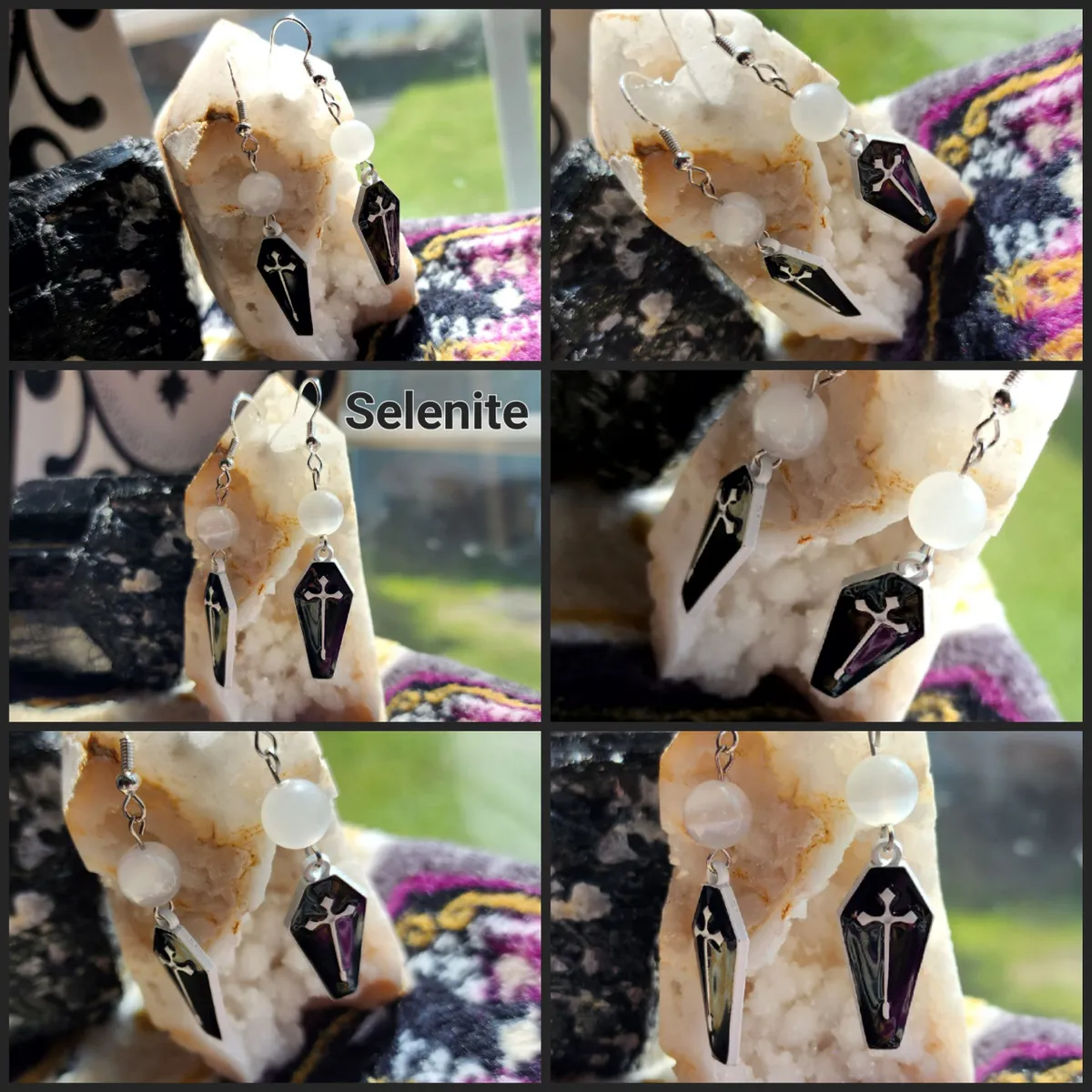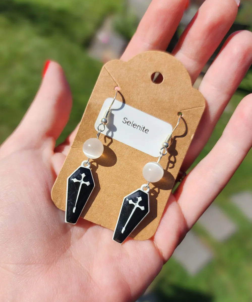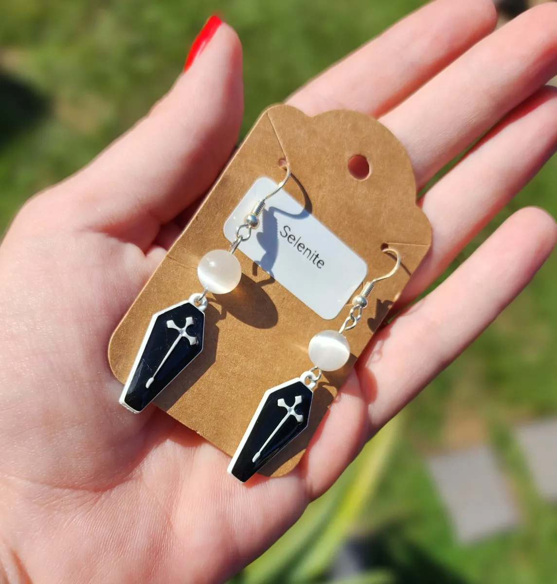 Not only do these earrings radiate beauty, but they also carry symbolic meanings. Selenite is believed to promote clarity of mind and spiritual growth, while the coffin-shaped dangle symbolizes embracing transformation and new beginnings.