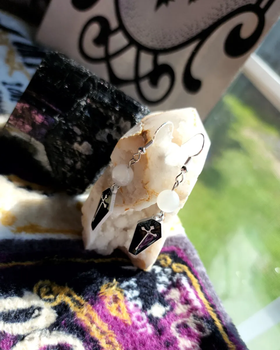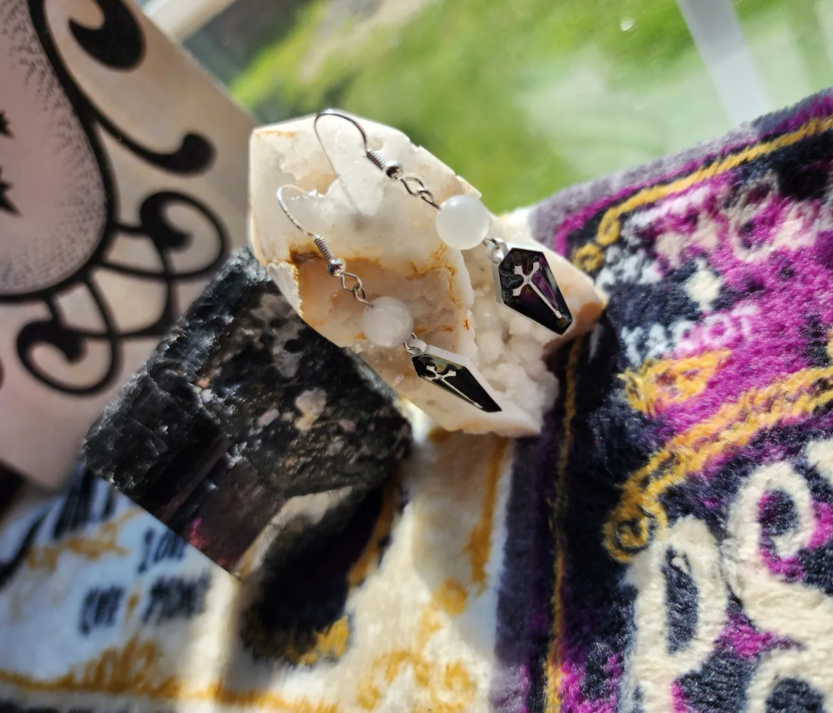 Crafted with a harmonious blend of white and black, these earrings exude a sense of sophistication and versatility. The white Selenite gemstone adds a touch of celestial charm, while the sleek black coffin infuse a hint of mysterious allure.