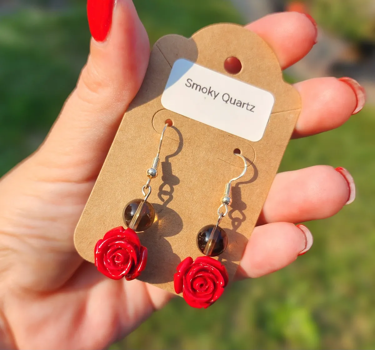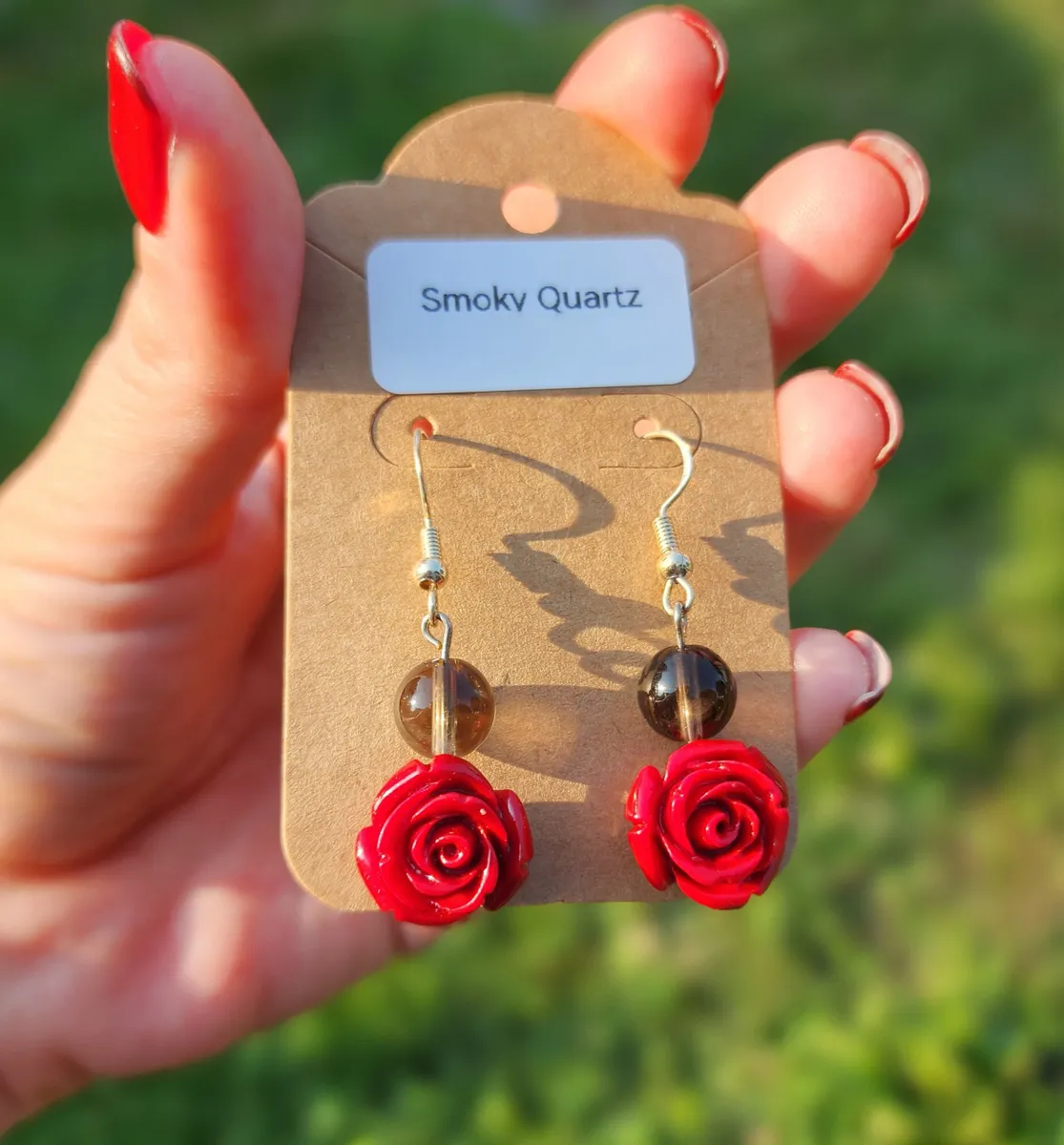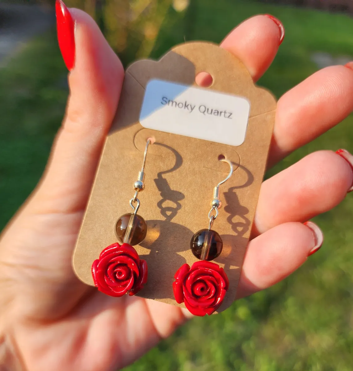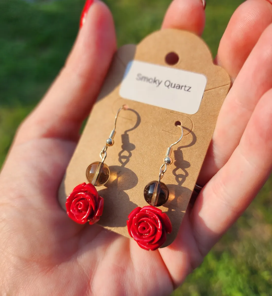 Add a touch of elegance and charm to your look with our Smoky Quartz Rose Earrings! These stunning earrings feature beautiful smoky quartz stone beads hanging above a delicate rose charm, creating a unique and eye-catching design. The earthy tones of the smoky quartz perfectly complement the vibrant red roses, making these earrings the perfect accessory for any outfit. Handcrafted with care and attention to detail, these earrings are sure to make a statement wherever you go. Treat yourself or someone special to these gorgeous earrings and add a touch of nature-inspired beauty to your jewelry collection.