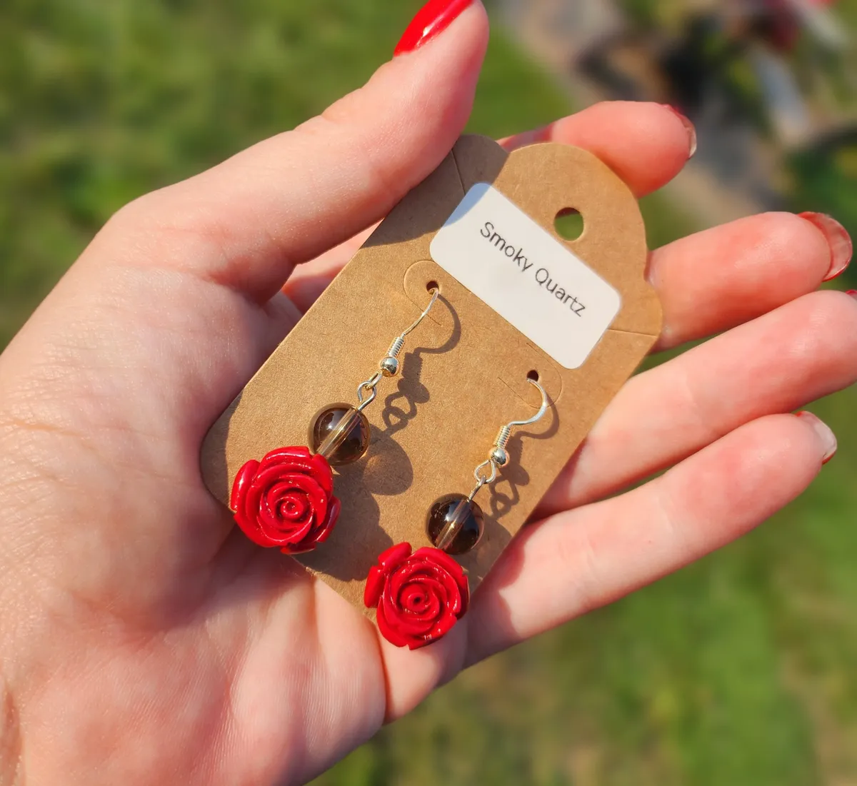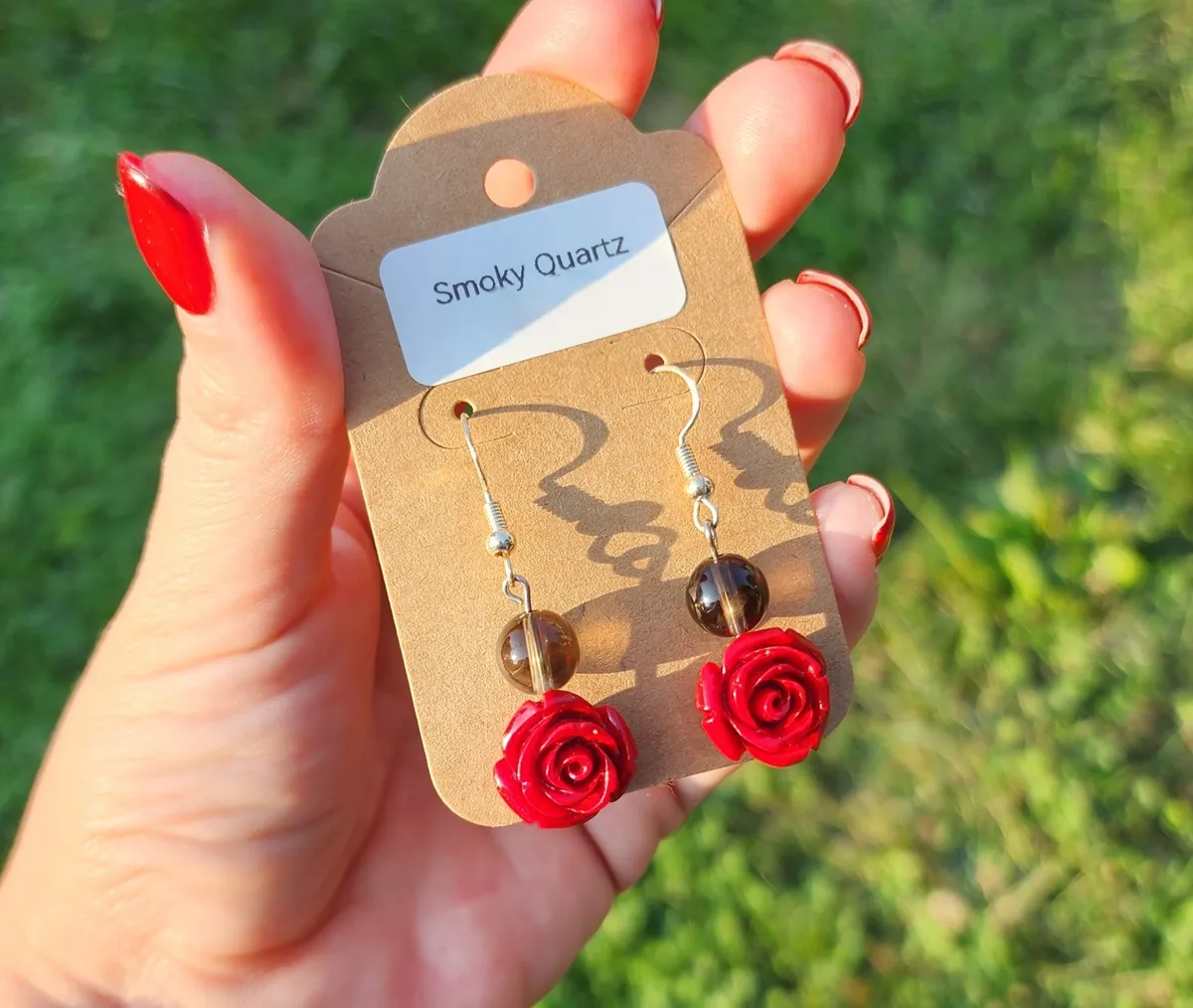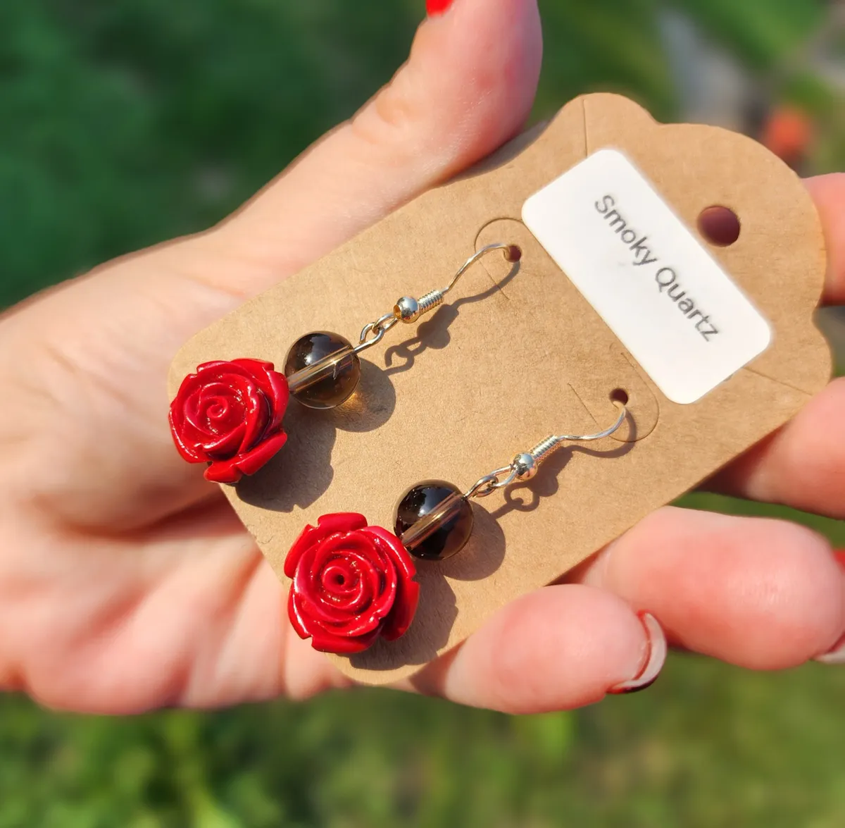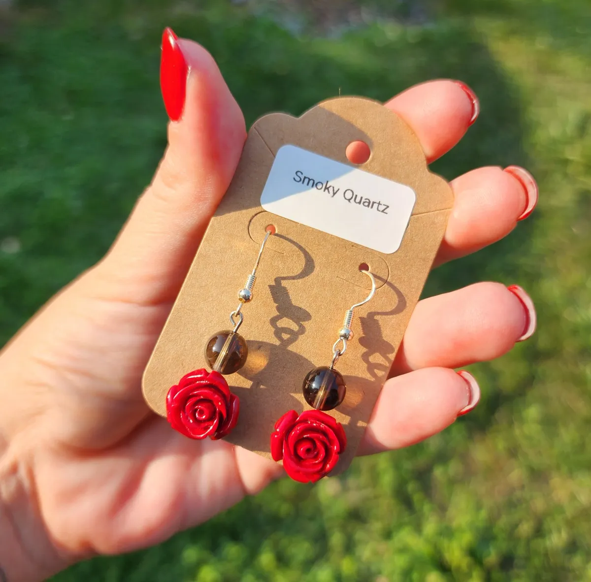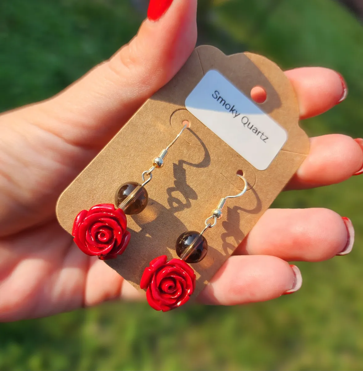 Add a touch of elegance and charm to your look with our Smoky Quartz Rose Earrings! These stunning earrings feature beautiful smoky quartz stone beads hanging above a delicate rose charm, creating a unique and eye-catching design. The earthy tones of the smoky quartz perfectly complement the vibrant red roses, making these earrings the perfect accessory for any outfit. Handcrafted with care and attention to detail, these earrings are sure to make a statement wherever you go. Treat yourself or someone special to these gorgeous earrings and add a touch of nature-inspired beauty to your jewelry collection.