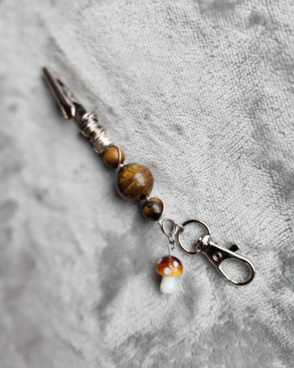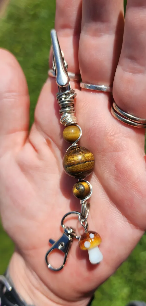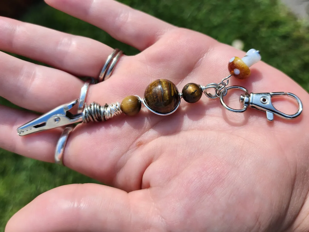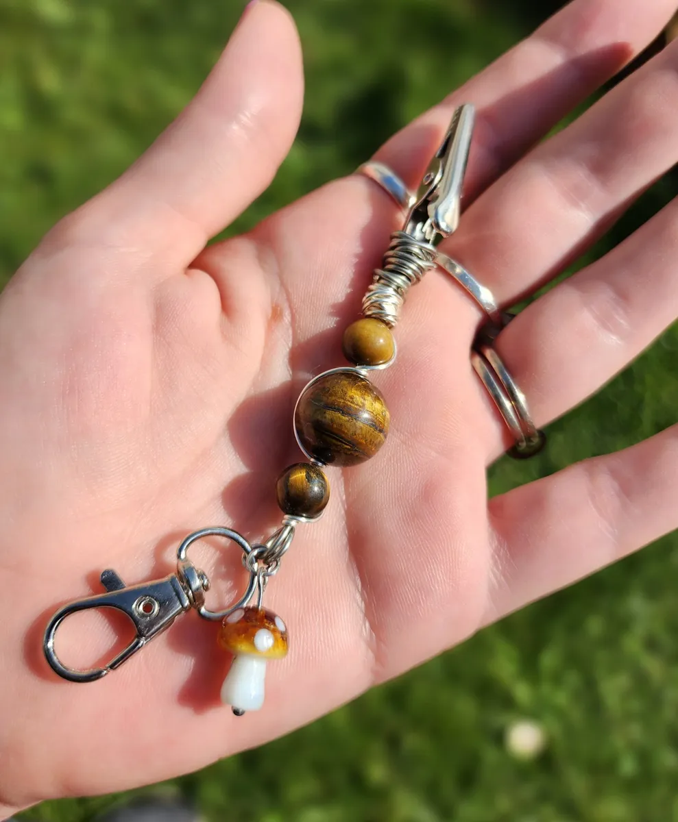 Introducing our wild and whimsical Tigers Eye Mini Roach Clips and Keychain with Mushroom Charm! This little gem is here to keep your joints secure and your style on point. Crafted with love, this keychain boasts gorgeous tiger’s eye beads that radiate strength and confidence, while the trusty clip ensures your tokes stay intact. And let’s not forget about the adorable mushroom charm – a nod to Mother Nature’s magical creations. Whether you’re a seasoned smoker or a lover of unique accessories, our Tigers Eye Mini Roach Clips and Keychain with Mushroom Charm will add a touch of charm and functionality to your everyday adventures. Get ready to turn heads and light up in style!