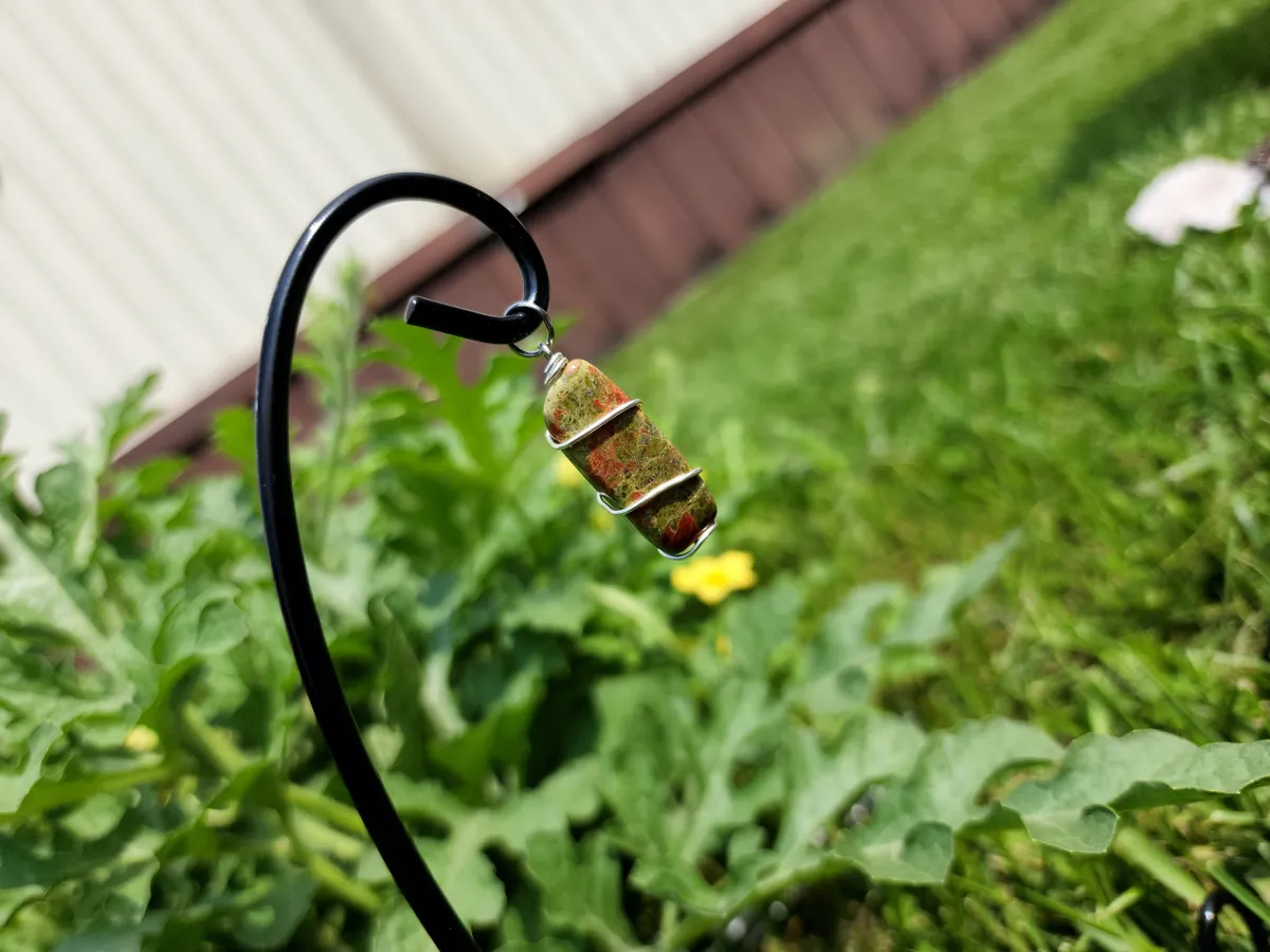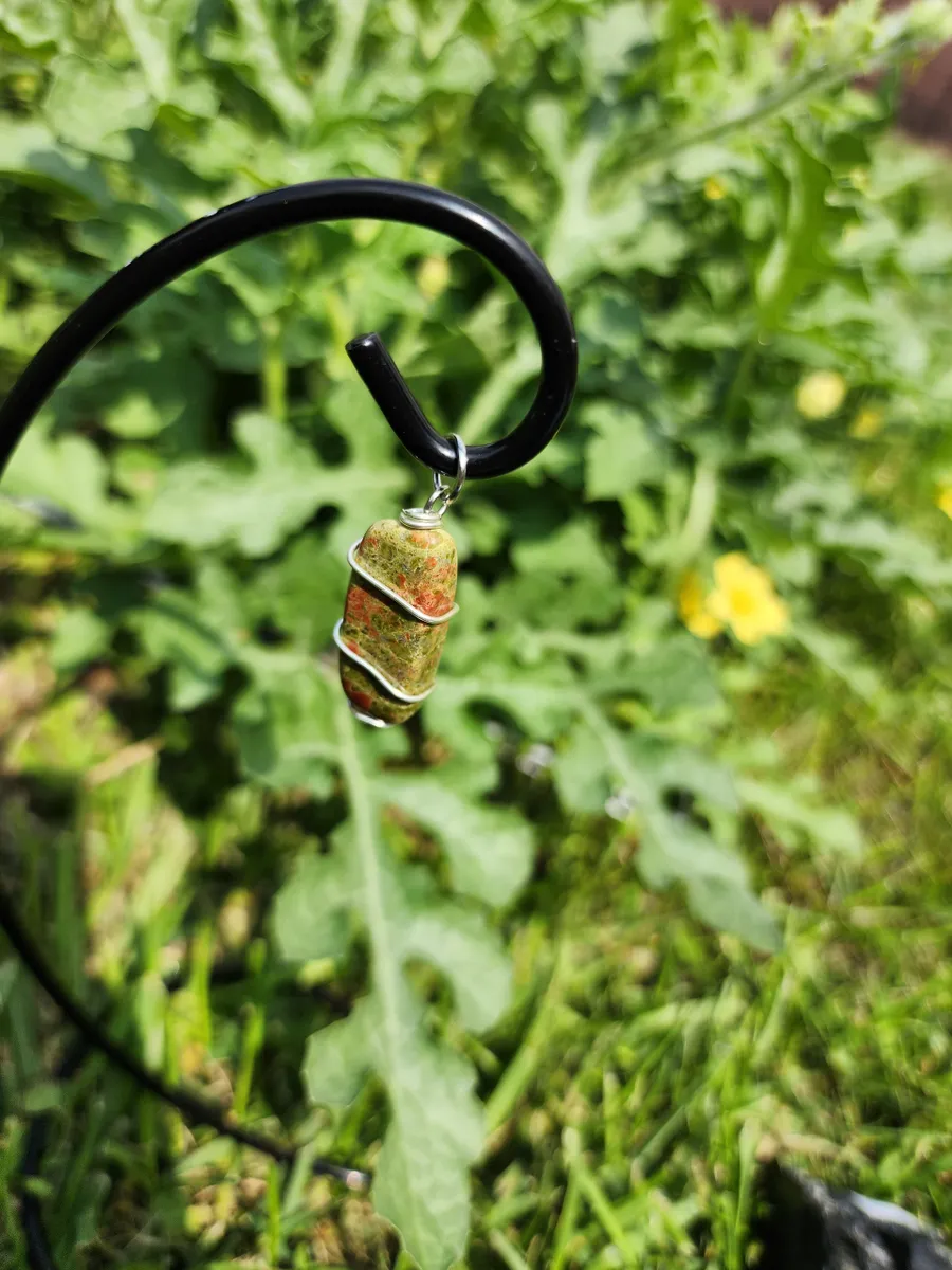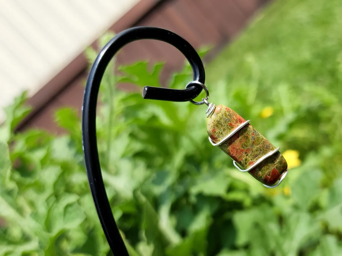 This wire wrapping technique was used to secure the pendant and to show off the natural beauty of the Unakite stone. Expertly crafted, the wire wraps around the stone, gracefully accentuating its beauty and ensuring its longevity.