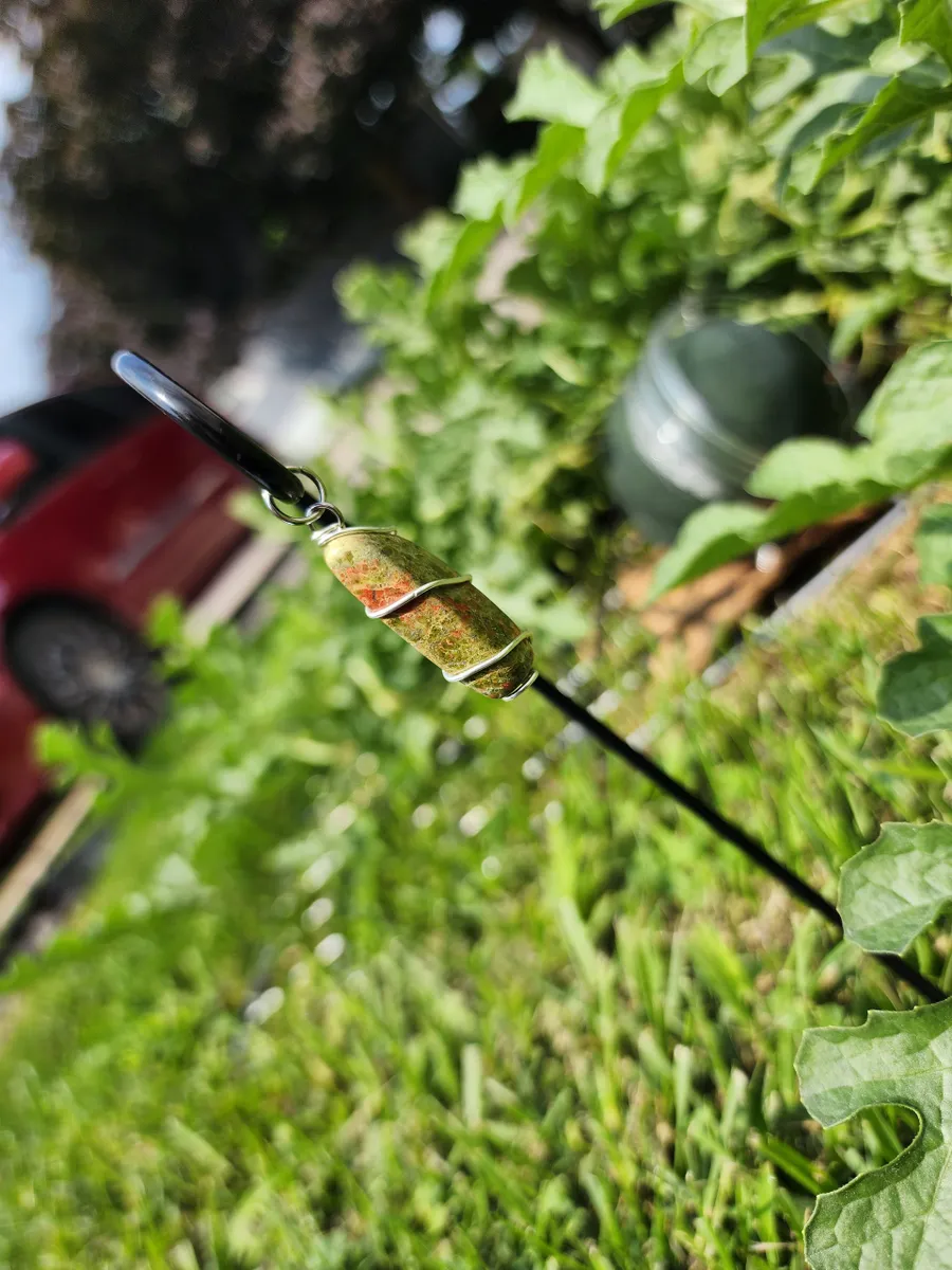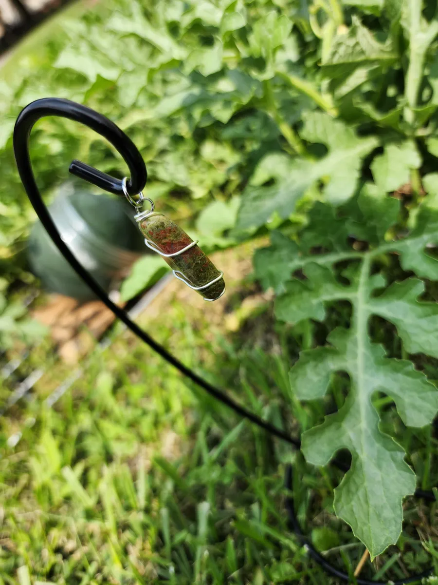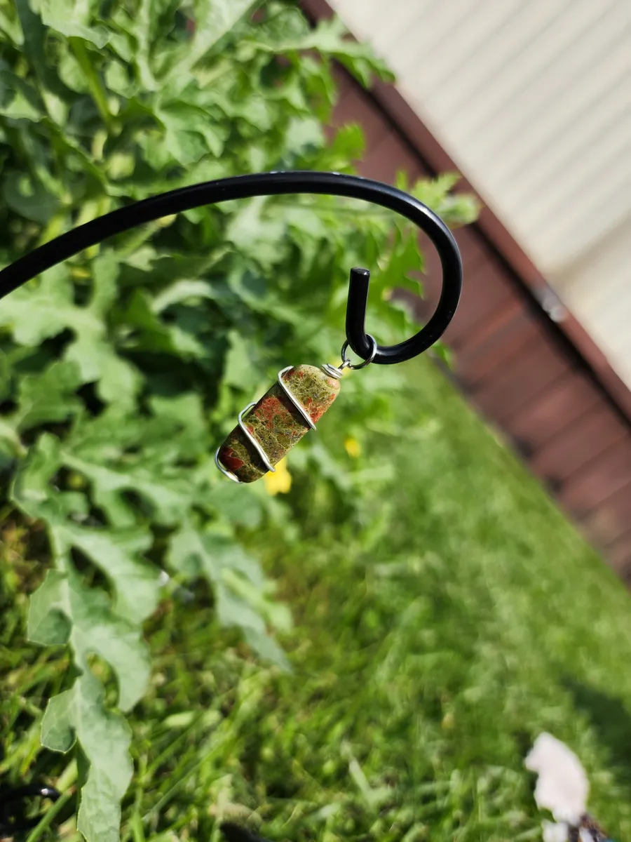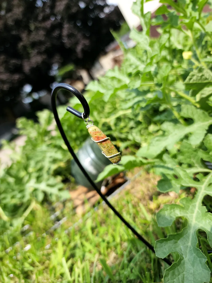 This wire wrapping technique was used to secure the pendant and to show off the natural beauty of the Unakite stone. Expertly crafted, the wire wraps around the stone, gracefully accentuating its beauty and ensuring its longevity.
